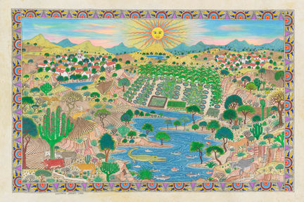 This community, and a few nearby villages, are at the center of a genre of “tourist art” iconic in Mexico and known throughout the world as amate or bark paintings. Inocencio was twelve years old when this form of painting first emerged and soon took over village life, with virtually every family learning the skills necessary to produce dozens of homogenized and highly stylized works every week. He was eighteen when the 1968 Olympics were held in Mexico City and the government ordered hundreds of thousands of drawings, small and large, to meet the demand of the influx of visitors to Mexico.